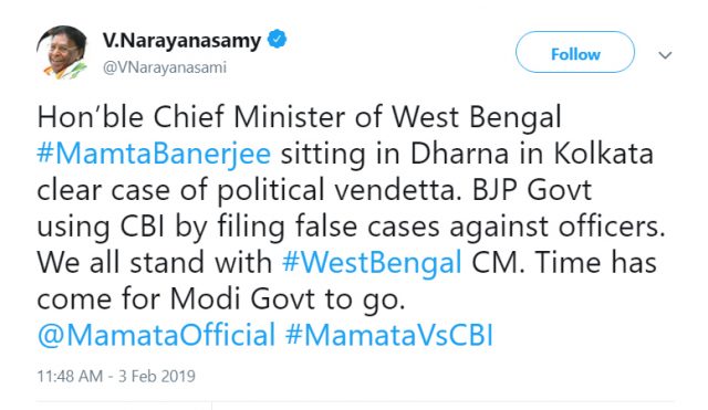 இதுகுறித்து தனது டிவிட்டர் பக்கத்தில் பதிவிட்டுள்ள முதல்வர் நாராயணசாமி, மேற்கு வங்க முதல்வர் மம்தா பானர்ஜிக்கு எப்போதும் ஆதரவாக நிற்போம் என்றும், மோடி அரசை விரட்ட நேரம் வந்துவிட்டது என தெரிவித்துள்ள அவர், அரசியல் பழிவாங்கும் நடவடிக்கையாக நேர்மையான அதிகாரிகள் மீது ஆளும் பாஜக அரசு சிபிஐயை வைத்து பொய்வழக்கு போடுகின்றனர் என கருத்து தெரிவித்துள்ளார்.