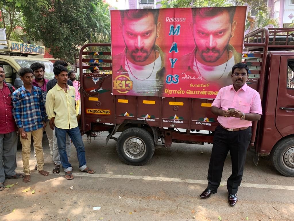 சென்னை அருகில் இருக்கிறது பொன்னேரி. இந்த ஊரில் வசிக்கும் ரோஸ் பொன்னையன் ஒரு தி.மு.க பிரமுகர். அதுமட்டுமின்றி அவர் நடிகர் அருள்நிதியின் ரசிகருமாம்! அருள்நிதி நடிப்பில் தயாராகியுள்ள “K 13” திரைப்படம் மே 3 அன்று உலகமெங்கும் வெளியாகிறது.