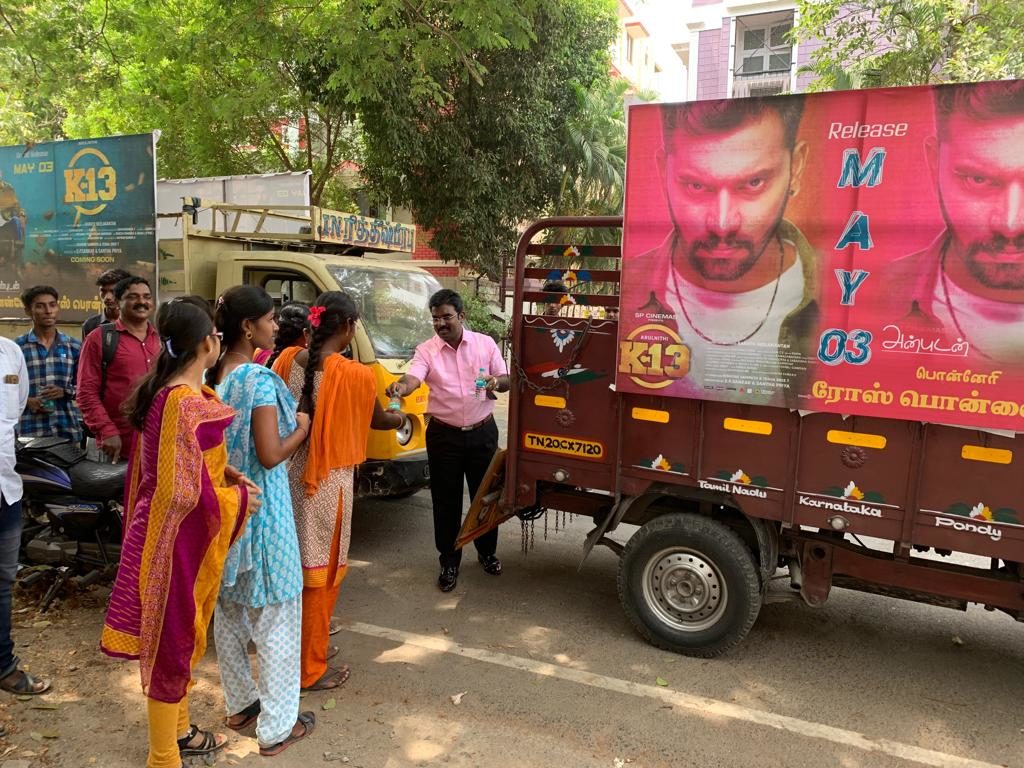 ரோஸ் பொன்னையனின் இந்த இலவச தண்ணீர் பாட்டில் வழங்கும் செயல், வெயிலில் பயணிக்கும் மக்களுக்கும் உதவியாக இருக்கிறது, அதே போல “K 13” படத்தின் விளம்பரமாகவும் இருக்கிறது. இலவச தண்ணீர் பாட்டில் வாங்கிய அனைவரும் “K 13” பார்க்க போகிறார்களோ இல்லையோ, ரோஸ் பொன்னையாவை கண்டிப்பாக மனதில் நினைவு வைப்பார்கள்.
